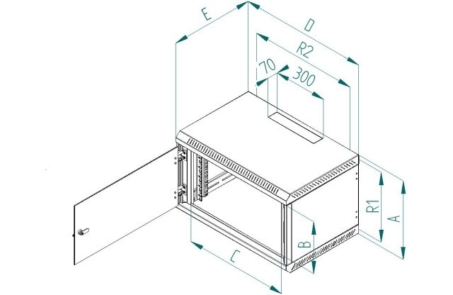 Rozvaděč Delta B je celosvařený nástěnný jednodílný rozvaděč s celoskleněnými dveřmi, které je možné díky masivním pantům otevřít pod úhlem téměř 180°. Důležitou součástí výrobku jsou otvory pro kabely, které jsou umístěny na horní a dolní stěně. Další dva otvory jsou umístěny na zadní stěně rozvaděče. Otvory jsou zaceleny vylamovacími záslepkami, které je možné vylomit s pomocí např. šroubováku. 19“ zařízení se instalují na vertikální lišty, které je možné plynule natavit podle potřeby do hloubky těla rozvaděče. Díky perforaci je zajištěna přirozená cirkulace vzduchu a chlazení komponentů. Přesné rozměry a další technické údaje jsou uvedeny níže (hodnoty R1 a R2 označují rozteče montážních otvorů pro zavěšení rozvaděče na zeď). Maximální zatížení rozvaděče je 30 kg. Rozměry: A – 370 mm B – 265 mm C – 490 mm D – 600 mm E – 395 mm R1 – 324 mm R2 – 420 mm Hmotnost – 14,8 kg Příbal: Klíč - přední dveře 2x Vrut 6x50 4x Podložka 6,6 4x Hmoždinka 10 4x Plastová podložka 8x Plovoucí matice M6 8x Šroub M6x16 8x Protiprachová záslepka 1x.