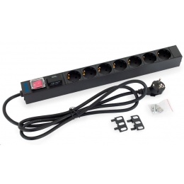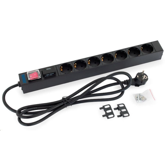 19“ rozvodný panel 1U; 7 x zásuvka podle DIN, max. 16 A; kabel 3 x 1,5 mm, 2 m + zástrčka univerzál CZ-DE max. 16 A; bleskojistka; podsvícený vypínač s bezpečnostním krytem; RAL 9005