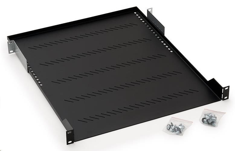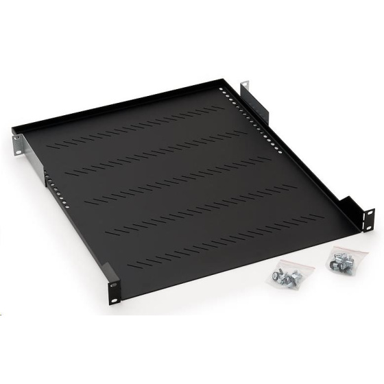 Polička s perforací 1U/550mm RAL 9005 černá V porovnání se standardní policí má tento typ nižší nosnost, ale v rozvaděči nezabírá 1U. Díky své konstrukci tak umožňuje plné využití instalačních pozic v rozvaděči. Takové řešení je výhodou zejména u stísněných instalací nebo v případě nástěnných rozvaděčů. Perforované tělo police zajišťuje proudění vzduchu. Police hluboké 150 mm a 250 mm se instalují pouze na přední vertikální lišty. Zadní držáky, které jsou součástí dodávky police od hloubky 350 mm, zvyšují nosnost police po připevnění na druhý pár vertikálních lišt. Příbal: Montážní sada Nosnosti poliček: 150mm - 15 kg 250mm - 20 kg 350mm - 40 kg 450mm - 40 kg 550mm - 40 kg 650mm - 40 kg 750mm - 40 kg.
