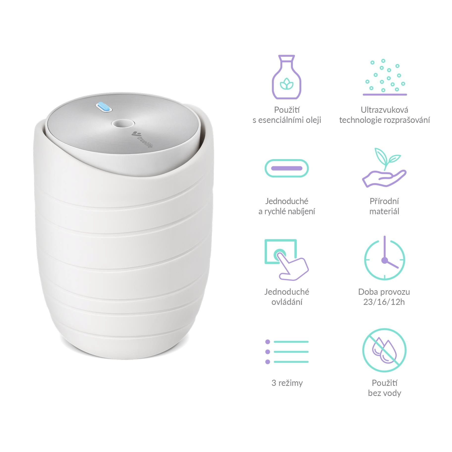 Užívejte si dlouhé hodiny příjemné vůně, která pronikne do každého kousku vašeho bytu, kanceláře či studia. Díky kompaktnímu designu umístíte difuzér TrueLife AIR Diffuser WL5 opravdu kamkoliv. Baterie vydrží v provozu 23, 16 nebo 12 hodin v závislosti na výběru jednoho ze 3 režimů intenzity uvolňování vůně. Difuzér se obejde zcela bez vody, na speciální nástavec pouze našroubujete lahvičku s esenciálním olejem, který je rovnoměrně uvolňován díky technologii OilFlow®. Vůně do vzduchu proniká pomocí ultrazvukové technologie, která pracuje velmi tiše. Difuzér se stane i ozdobou každého interiéru díky svému designu a přírodnímu tělu z keramiky. Jakmile poklesne kapacita baterie, difuzér vás upozorní a vypne se. Pak ho pouze stačí připojit přes USB-C a dobít.