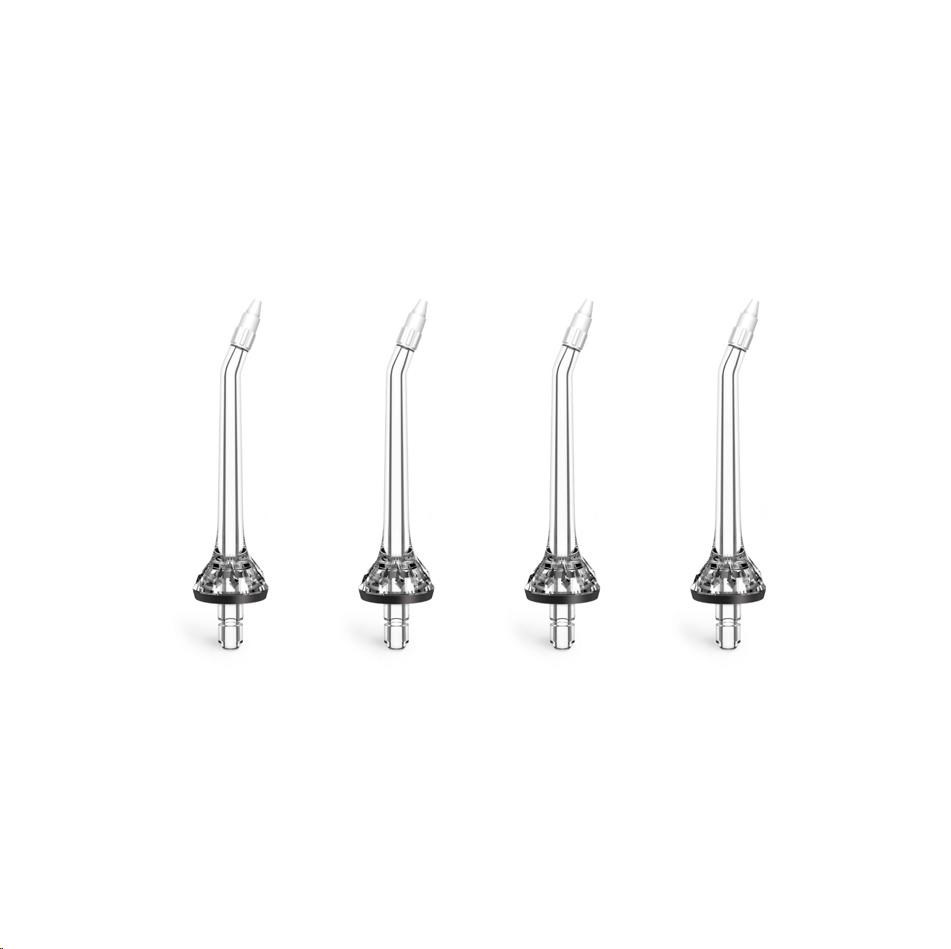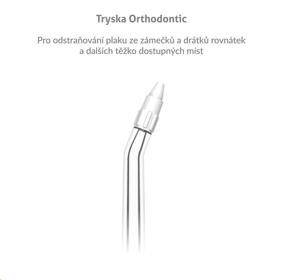 Ortodontická tryska pro odstraňování plaku ze zámečků a drátků rovnátek a dalších těžko dostupných míst.