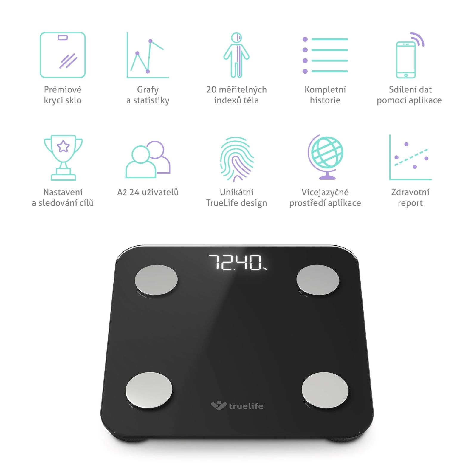 Chytrá váha TrueLife FitScale W1 BT Black měří pomocí bioelektrické impedanční analýzy (BIA) celkovou tělesnou kompozici, díky čemuž zjistíte kromě hmotnosti i další informace jako poměr svalové hmoty, tuku, vody. Celkově je k dispozici 20 měřitelných indexů, jejichž vysvětlení najdete v aplikaci Fitdays, která poskytuje kompletní a přehledný report o stavu vašeho zdraví a kondice, zároveň navrhuje cesty ke zlepšení. Propojení váhy s aplikací probíhá přes Bluetooth a data se poté automaticky synchronizují.