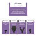 Každý sval si zaslouží speciální péči, proto je masážní pistole TrueLife RelaxGun G1 vybavena čtyřmi vyměnitelnými silikonovými hlavicemi. Kulatá hlavice je univerzální volbou pro velké svalové partie a využijete ji jak před tréninkem, tak i po něm. Plochá hlavice díky svému rovnoměrnému tlaku skvěle poslouží k jemnému uvolnění svalů v blízkosti kloubů a kostí. Pro šíji, páteř nebo lýtka zvolte vidlicovou hlavici, která je ideální pro nepřímou masáž hlubších vrstev svalů. Naopak při potřebě přesné bodové masáže citlivých nebo těžko dostupných míst využijete hrotovou hlavici.