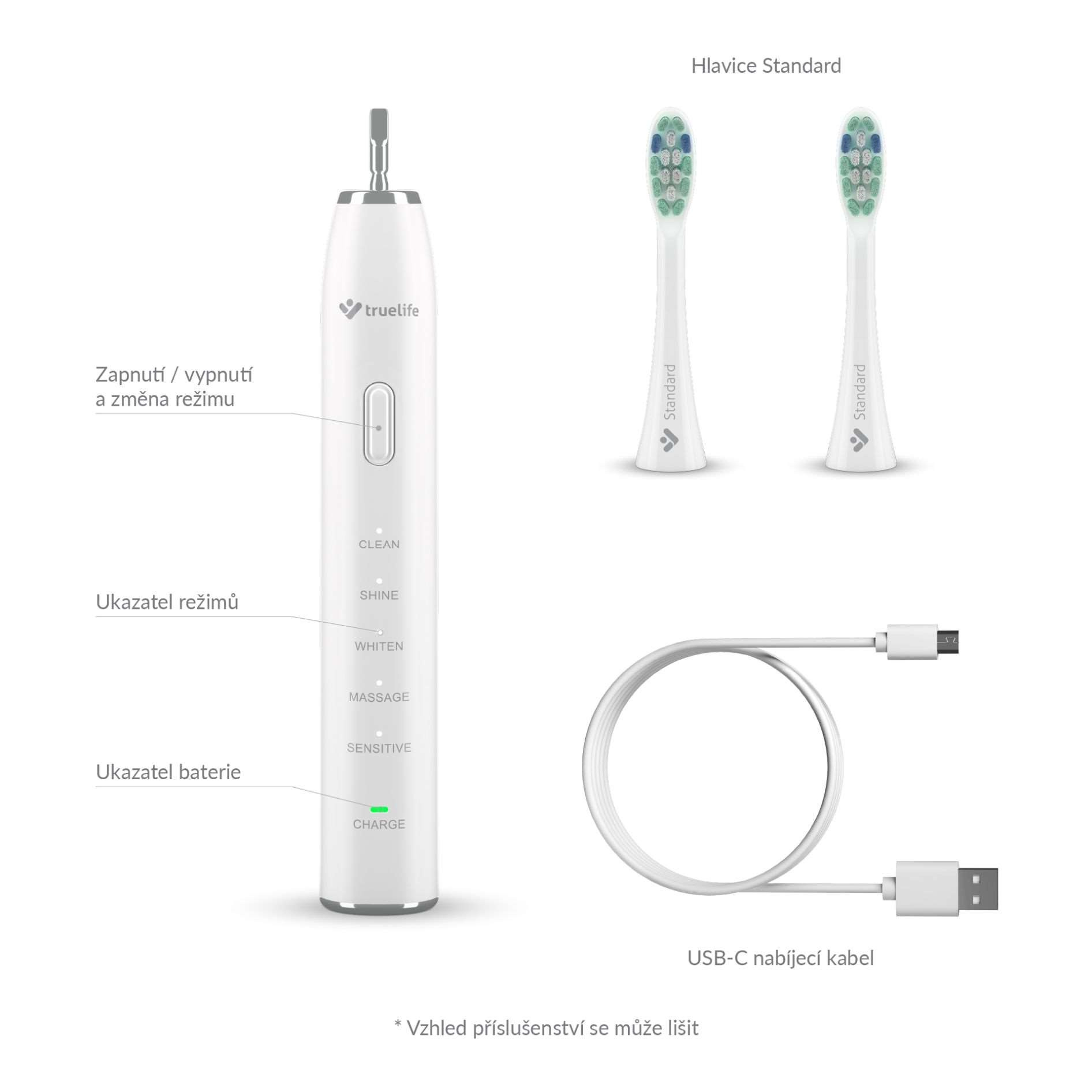 Krásný úsměv začíná správnou každodenní péčí o zuby. Skvělým cenově dostupným a výkonným pomocníkem je sonický kartáček TrueLife SonicBrush Clean30 se sonickou technologií SonicTrue®. Jeho 70 000 pohybů za minutu zuby dokonale vyčistí a jde i dál díky možnosti výběru z 5 režimů čištění. Clean vyčistí zuby a odstraní zubní plak, Shine zbaví zuby skvrn od čaje a kávy, k vybělení slouží režim Whiten, dásním udělá dobře Massage a pro citlivé zuby a dásně je určen režim Sensitive. Balení obsahuje 2 hlavice Standard, jejichž modré štětinky zhruba po třech měsících zbělají. Tím indikují, že je potřeba hlavici vyměnit. Na jedno nabití vydrží kartáček 30 dní, pak ho jen stačí dobít pomocí přiloženého USB-C kabelu.