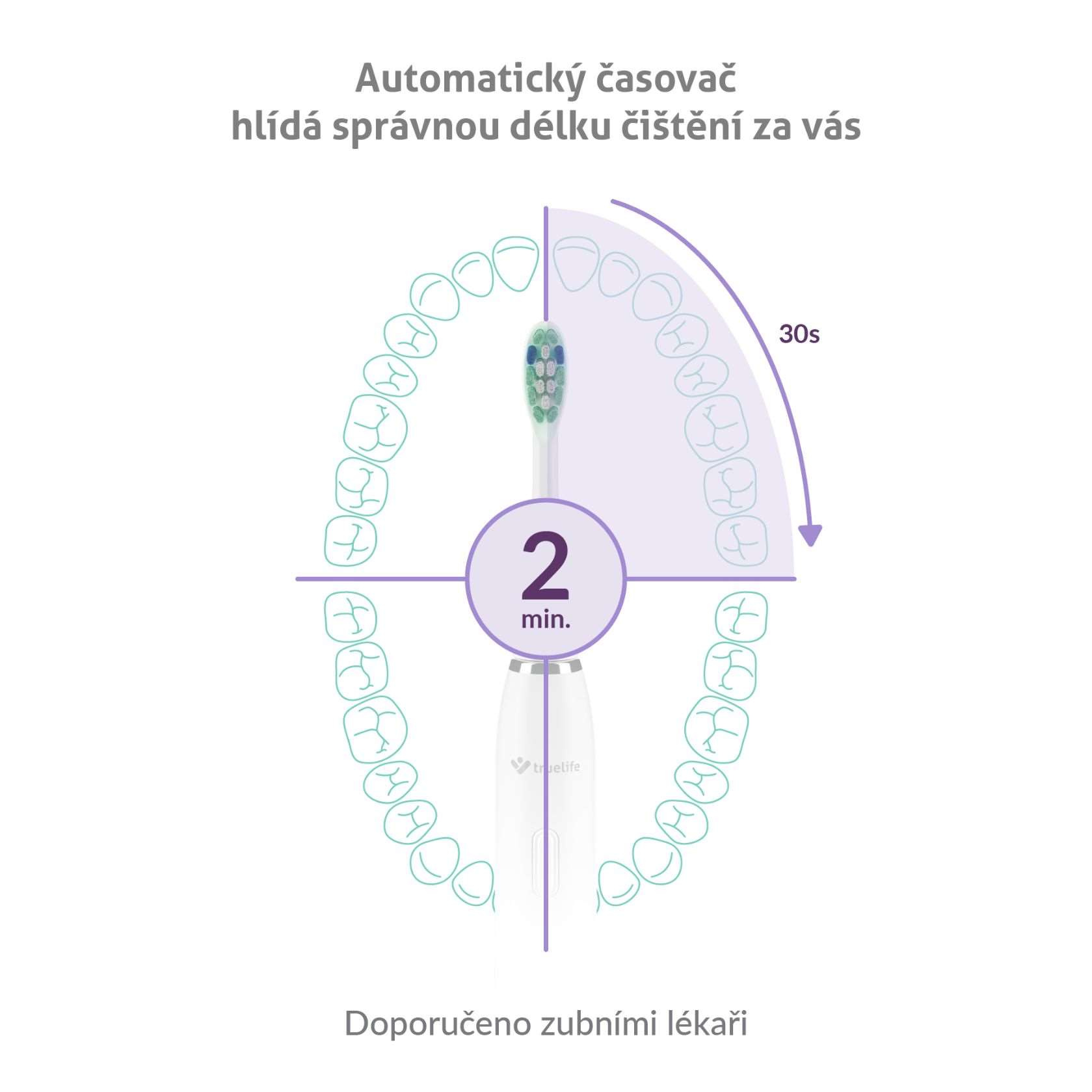 Sonická technologie představuje účinný způsob boje proti zubnímu plaku. Oproti rotačním kartáčkům je šetrnější k zubní sklovině a vířením vody s pastou pomáhá čistit i mezizubní prostory. SonicTrue® technologie funguje na bázi jemných vibrací, kdy oproti manuálnímu kartáčku, kterým uděláte přibližně 600 pohybů za minutu, zvládne TrueLife SonicBrush Clean30 za jednu minutu až 70 000 pohybů pro zářivý úsměv bez námahy. Hlavice kartáčku vydrží až 3 měsíce používání, poté se štětiny začnou třepit, ztrácí účinnost a navíc se na nich hromadí bakterie. Naštěstí jsou hlavice opatřeny modrými štětinami, které po 3 měsících vyblednou a vy tak víte, že je načase je vyměnit.