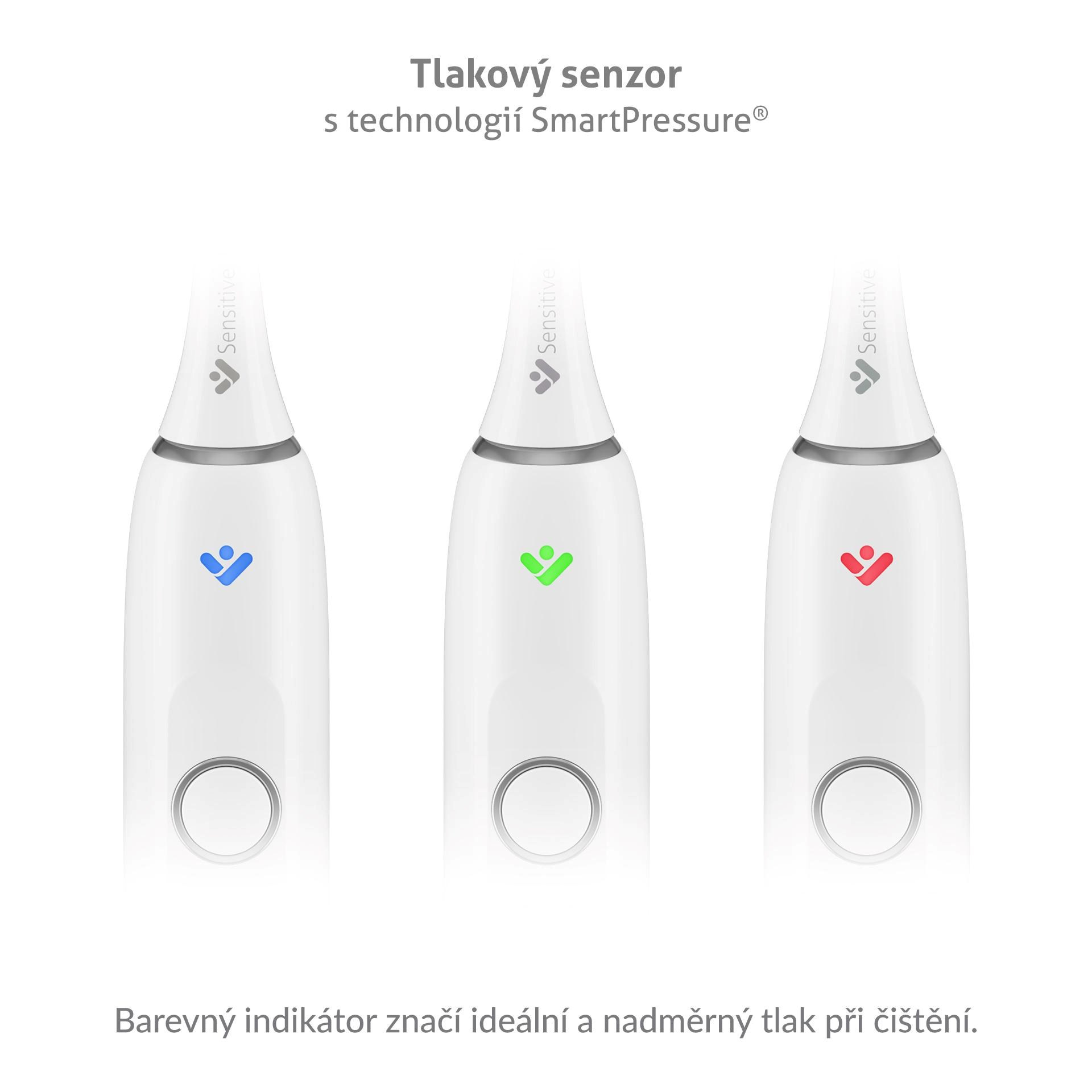 Chytrý senzor pozná, kdy na zuby tlačíte příliš. Barevné světlo, viditelné zepředu i zezadu, vám tak okamžitě dá signál, kdy je potřeba zvolnit.