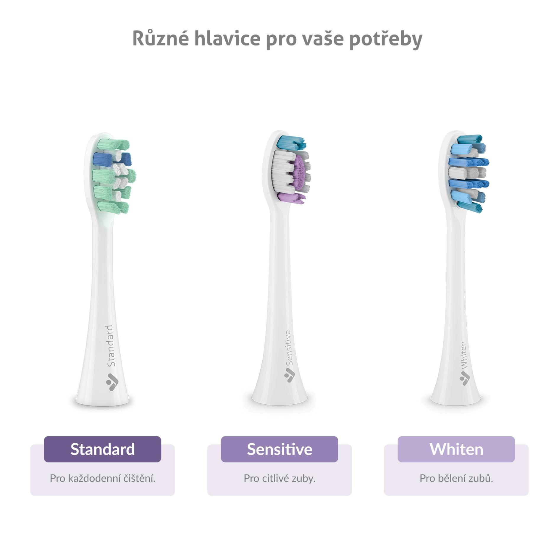 V balení najdete pro každý kartáček 2 náhradní hlavice, z čehož jednu využijete pro každodenní čištění (Standard), druhou pro citlivé zuby (Sensitive). K dokoupení jsou i hlavice Whiten na bělení zubů.