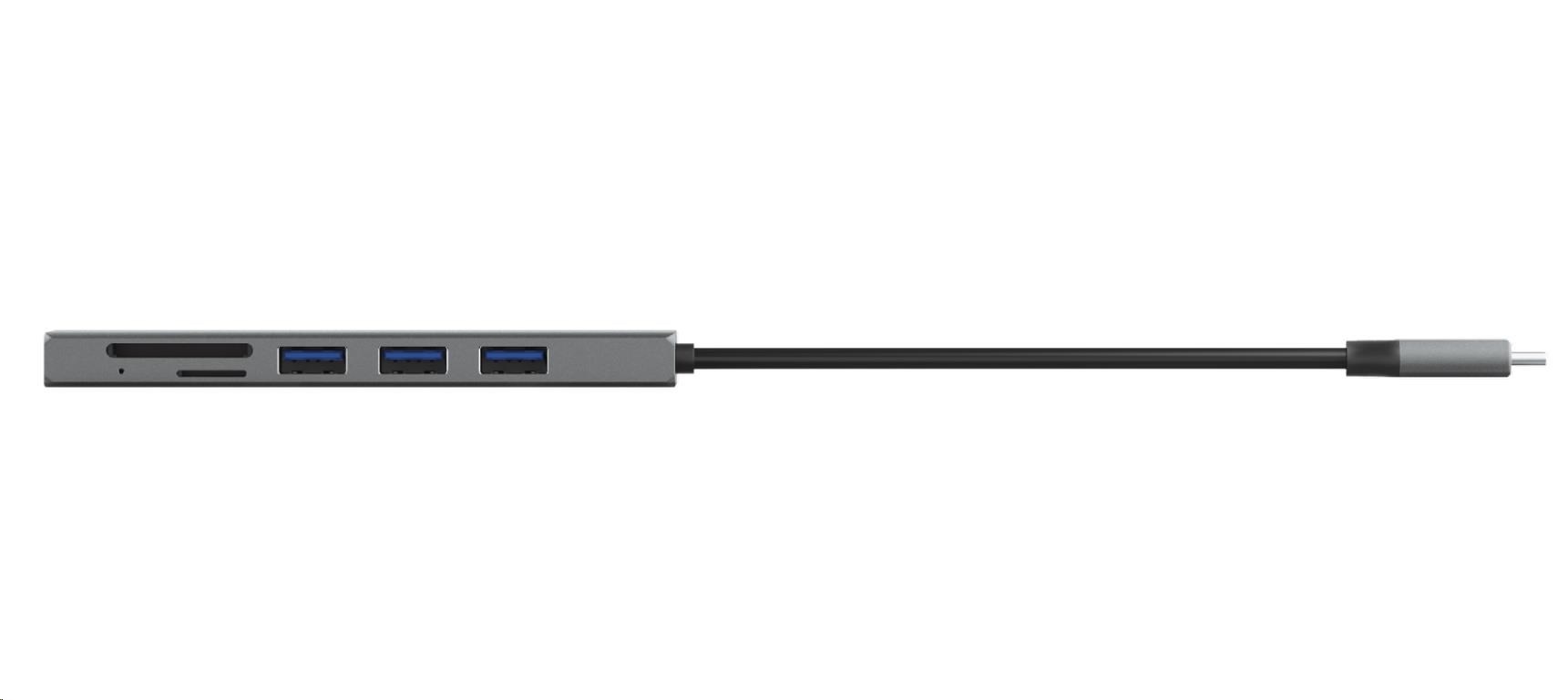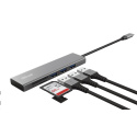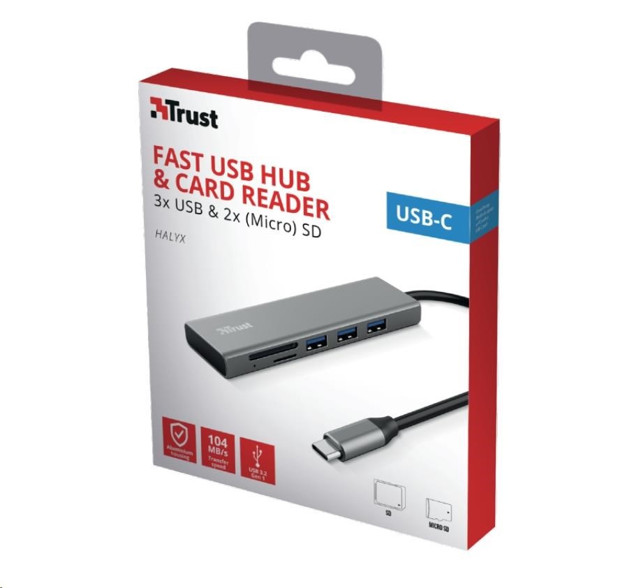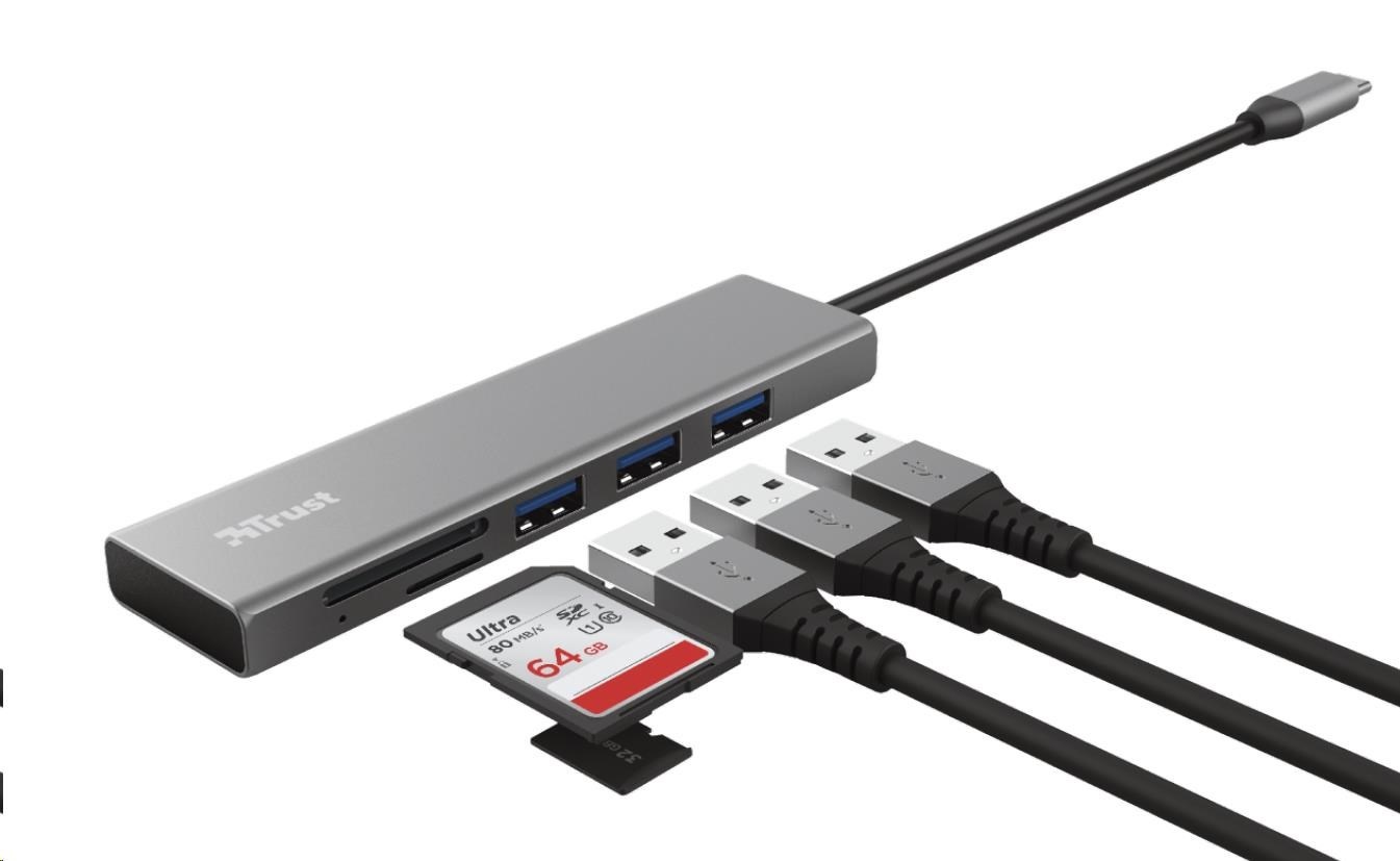 Compact, aluminium 3-port USB hub with (micro) SD card reader and USB-C connection