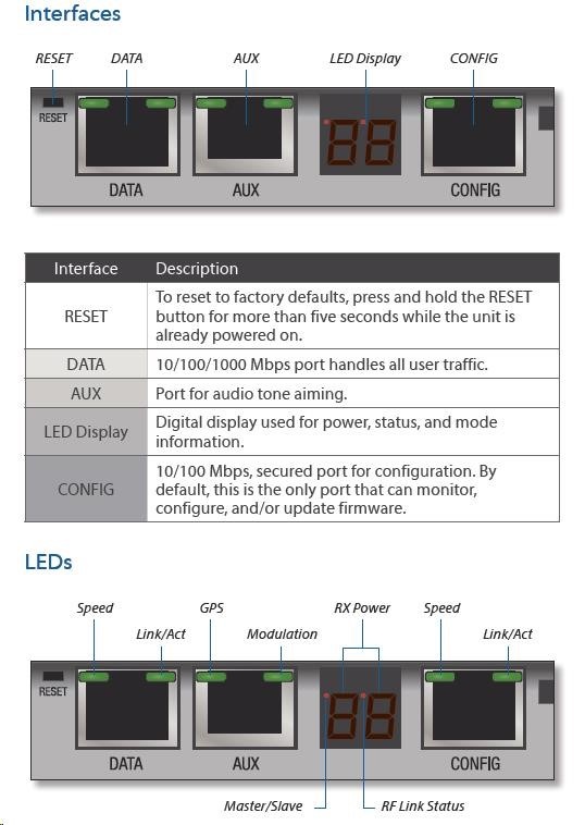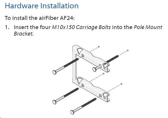 Technické specifikace: airFiber AF24 Dimensions 649 x 426 x 303 mm Weight 10.5 kg (Mount Included) Operating Frequency 24.05 – 24.25 GHz Max Power Consumption < 50 W Power Supply 50V, 1.2A PoE GigE Adapter (Included) Power Method Passive Power over Ethernet (42-58VDC) Certifications CE, FCC, IC Mounting Pole Mount Kit (Included) Wind Loading 69 lbf @ 100 mph Operating Temperature -40 to 55° C (-40 to 131° F) Networking Interface Data Port (1) 10/100/1000 Ethernet Port Configuration Port (1) 10/100 Ethernet Port Maximum Throughput 1.4+ Gbps Maximum Range 13+ km Packets per Second > 1 Million Encryption 128-Bit AES Forward Error Correction 164/205 Cyclic Prefix 1/16 Fixed Uplink/Downlink Ratio 50% Fixed GPS GPS Clock Synchronization Transceiver EIRP ~33 dBm (FCC/IC), ~20 dBm (CE) Frequency Accuracy ±2.5 ppm without GPS Synchronization ±0.2 ppm with GPS Synchronization Channel Bandwidth 100 MHz Operating Channels 24.1 GHz, 24.2 GHz Modulation 64QAM MIMO 16QAM MIMO QPSK MIMO QPSK SISO 1x QPSK SISO Integrated Split Antenna TX Gain 33 dBi RX Gain 38 dBi Beamwidth < 3.5° Front-to-Back Ratio 70 dB Polarity Dual-Slant Polarization Cross-Polarity Isolation > 28 dB