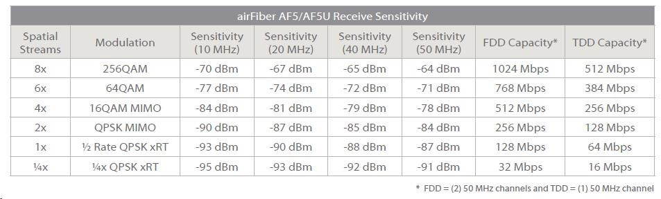 Technické specifikace: Dimensions 938.4 x 468.4 x 281.4 mm Weight 16 kg (Mount included) Max. Power Consumption 40 W Power Supply 50V, 1.2A PoE GigE Adapter (Included) Power Method Passive Power over Ethernet (42-58VDC) Certifications CE, FCC, IC Mounting Pole Mount Kit (Included) Wind Loading 194 lbf @ 125 mph Wind Survivability 125 mph Operating Temperature -40 to 55°C LEDs (12) Status LEDs: Data Port Link/Activity Data Port Speed Management Port Link/Activity Management Port Speed GPS Synchronization Master/Slave Link Status Modulation Mode 0.25x to 4x, 6x, 8x, Overload Remote and Local Displays (Calibrated Signal Strength) Interface Data Port (1) 10/100/1000 Ethernet Port Management Port (1) 10/100 Ethernet Port Auxiliary Port (1) RJ-12, Alignment Tone Port System Maximum Throughput 1.0+ Gbps Maximum Range 100+ km (Dependent on Regulatory Region) Packets per Second 1+ Million Encryption 128-Bit AES Forward Error Correction 164/205 Cyclic Prefix 1/16 Fixed Uplink/Downlink Ratio 50% Fixed Radio Frame Synchronization GPS Dynamic Frequency Selection Operating Frequency: AF5U FCC 15.247, IC RSS 21 : 5725 - 5850 MHz ETSI EN 302 502 : 5725 - 5875 MHz Other Regions : 5725 - 6200 MHz -------------------------------------------------------------------- airFiber AF5/AF5U Receive Sensitivity Spatial Streams Modulation Sensitivity FDD Capacity* TDD Capacity* 8x 256QAM -65 dBm 1024 Mbps 512 Mbps 6x 64QAM -72 dBm 768 Mbps 384 Mbps 4x 16QAM MIMO -77 dBm 512 Mbps 256 Mbps 2x QPSK MIMO -83 dBm 256 Mbps 128 Mbps 1x 1 Rate QPSK xRT -87 dBm 128 Mbps 64 Mbps 1x 1x QPSK xRT -90 dBm 32 Mbps 16 Mbps * FDD = (2) 50 MHz channels and TDD = (1) 50 MHz channel GPS GPS Clock Synchronization Transceiver EIRP ~50 dBm (Dependent on Regulatory Region and Frequency Band) Frequency Accuracy ±2.5 ppm without GPS Synchronization ±0.2 ppm with GPS Synchronization Channel Bandwidth 10/20/40/50 MHz Modulation 256QAM MIMO 64QAM MIMO 16QAM MIMO QPSK MIMO 1 Rate QPSK xRT 1 Rate QPSK xRT Integrated Split Antenna TX Gain 23 dBi RX Gain 23 dBi Beamwidth 6° Front-to-Back Ratio 70 dB Polarity Dual-Slant Polarization Cross-Polarity Isolation > 28 dB
