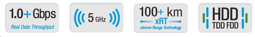 Současně nejvyspělejší technologie páteřního spoje v pásmu 5 GHz. Díky pokročilým technologiím HDD, eXtended Range, modulaci 256QAM komunikuje rychlostí až 1 Gbps. Spoj je možné realizovat do vzdálenosti 100km dle nastaveného výkonu. Pro kompletní spoj je třeba zakoupit dvě jednotky. Zařízení není možné provozovat na území ČR podle platných VO-R!