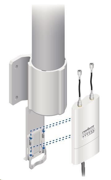 Jedná se o robusní řešení 10dbi všesměrové antény pro přístupové body pracující v pásmu 2.4GHz a využívajících standardu 802.11n v kombinaci s technologií MIMO. Anténa disponuje dvěma RSMA-female konektory. Součástí dodávky jsou dva voděodolné RSMA pigtaily pro propojení s jednotkou Rocket M2, držák pro tuto jednotku a montážní sada na stožár, viz. obr.