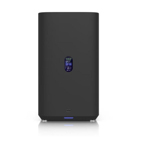 UniFi Network Attached Storage with (4) 2.5/3.5" HDD bays, (2) M.2 NVMe SSD cache slots, 2.5 GbE networking, USB-C connectivity, and an included PoE+++ adapter, all in a compact footprint..