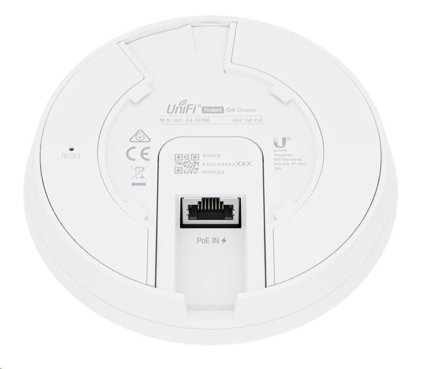 UniFi Protect G4 Dome kamera disponuje 4MP snímačem (2688 x 1512px) při 24fps, fixním objektivem (cca 4mm), IR přísvitem pro noční vidění, mikrofonem a reproduktorem. Kamera má velmi robustní tělo z kovového materiálu, odolnost IK08 proti vandalům a IPx4 proti povětrnostním vlivům. Do sítě se připojuje pomocí Gigabitového ethernetového portu, který podporuje napájení přes kabel - 802.3af PoE.