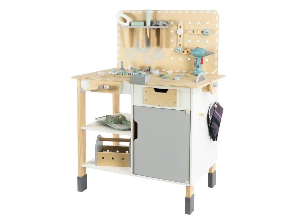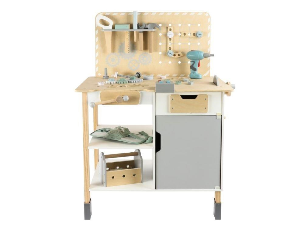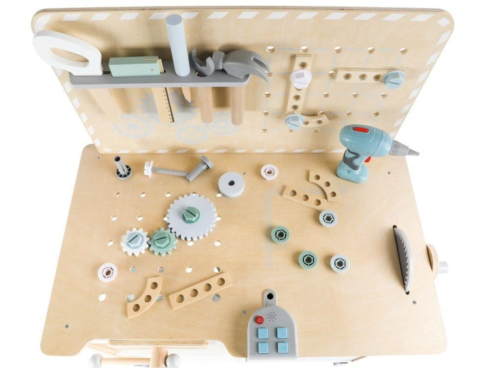 Popis Velký dřevěný dětský ponk s nářadím a rozšířeným příslušenstvím + opasek na nářadí ZDARMA