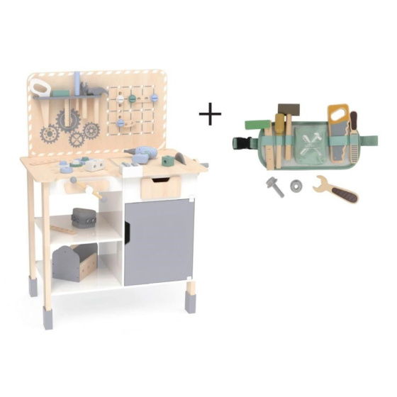Velký dřevěný dětský ponk s nářadím a rozšířeným příslušenstvím + opasek na nářadí ZDARMA