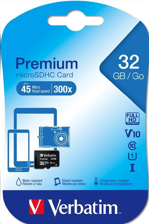 Verbatim Premium U1 Micro SDHC/SDXC Cards Verbatim Premium microSD memory cards expand the onboard memory of your mobile devices, such as smart phones and tablets. With capacities up to 128GB you can capture more high quality photos and full HD videos, carry more files, and enjoy your favourite music wherever you are. Compatible with any device with an SDHC/SDXC* memory card slot Verbatim Premium microSD memory Cards are waterproof & shockproof. Read Speed: 8GB up to 30MB/Sec.** 16GB+ up to 45MB/Sec** Write Speed: Min. 10MB/Sec Suitable for 1080p video capture *SDXC compatible host device required **UHS-1 compatible device required, actual performance may vary depending on host device, interface & usage conditions Product Dimensions: 11mm x 15mm x 1.0mm (L x W x H) (microSD only) Product weight: 0.2 grams (microSD only); 1.6 grams (microSD+ adapter) Capacity: 32GB.