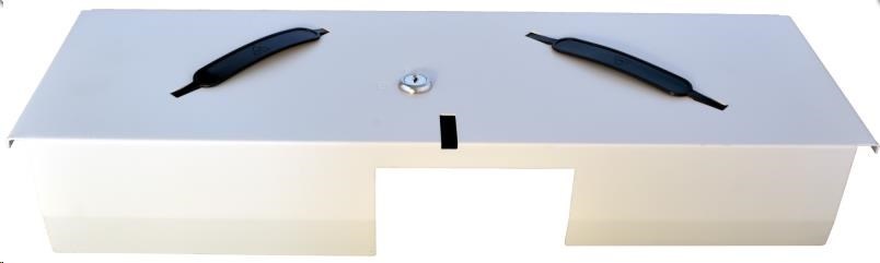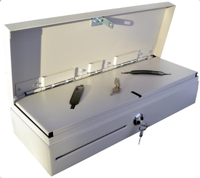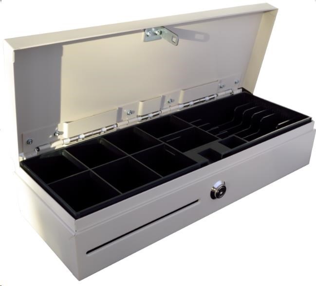 obsahuje Zásuvku s víkem, vnitřní plastový pořadač na peníze a mince, kovový uzamykatelný kryt na pořadač