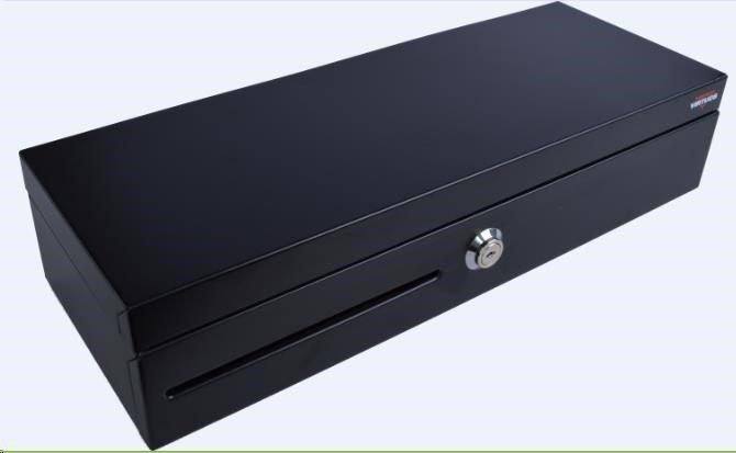 Popis Virtuos pokladní zásuvka FT-460C1; Flip top, bez víka, 9-24V, černá - s kabelem