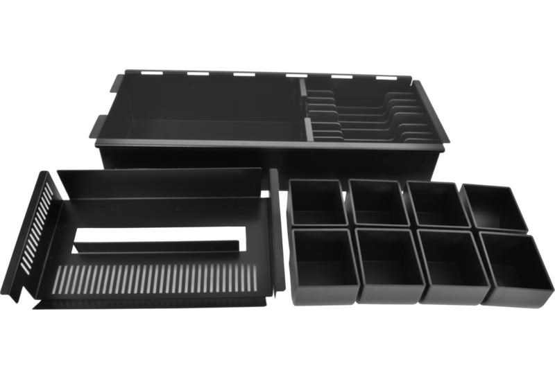 • Vyjímatelný kovový pořadač s nastavitelnými plastovými oddělovači přihrádek pro bankovky