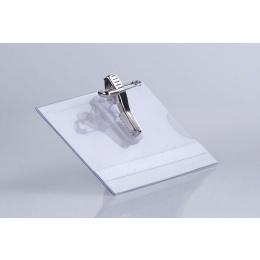 Tuhá, čirá visačka z PVC o rozměru 60×90 mm, s pojistným špendlíkem a svorkou „krokodýl“. Uvnitř s papírem 58×88 mm. Tloušťka PVC 0,3 mm zajišťuje tvarovou stálost..