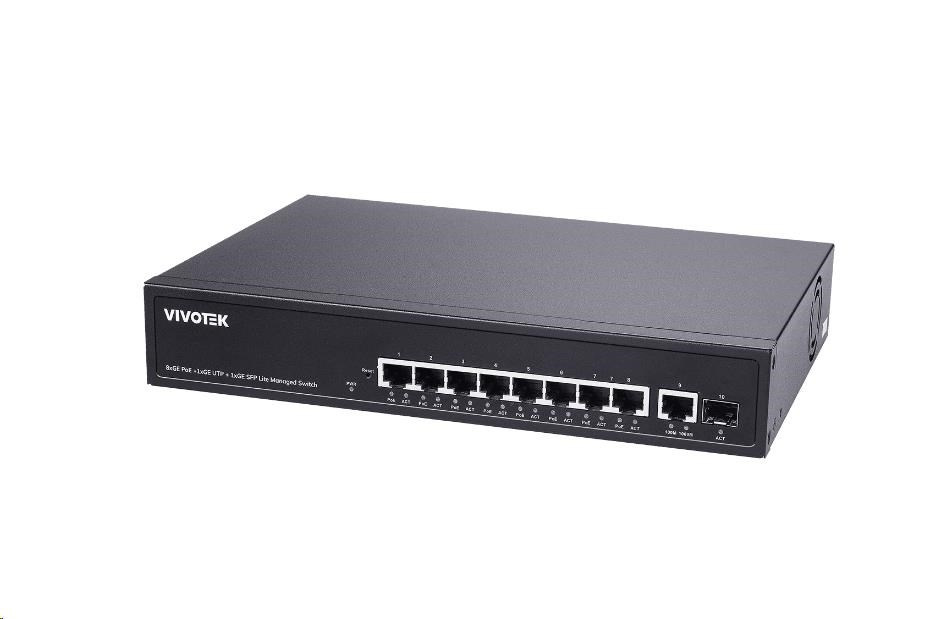 Popis Vivotek PoE switch AW-GEL-105A-110, 8xGE PoE(802.3af/at/bt, PoE budget 110W), 1xGbE RJ-45, 1xSFP 100M/1G slot