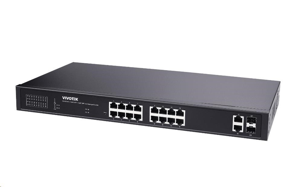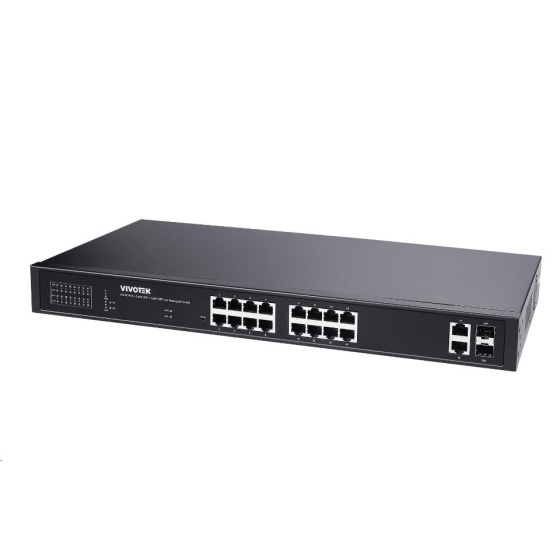 Popis Vivotek PoE switch AW-GEL-205A-260, 16xGE PoE(802.3af/at/bt, PoE budget 260W), 2xGbE RJ-45, 2xSFP 100M/1G slot