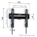 Tento nástěnný držák televizoru z řady COMFORT Fixed je ideálním řešením, pokud chcete televizor bezpečně a stylově připevnit na zeď. Nástěnný TV držák je vhodný pro televizory s úhlopříčkou od 19 do 50 palců a hmotností do 30 kg. Mezi televizorem a stěnou je vzdálenost pouhých 2,2 cm. Nástěnný držák televizoru TVM 3203 je pevný držák, který nelze otáčet ani naklápět. Ideální volba, pokud sedíte přímo před televizorem.