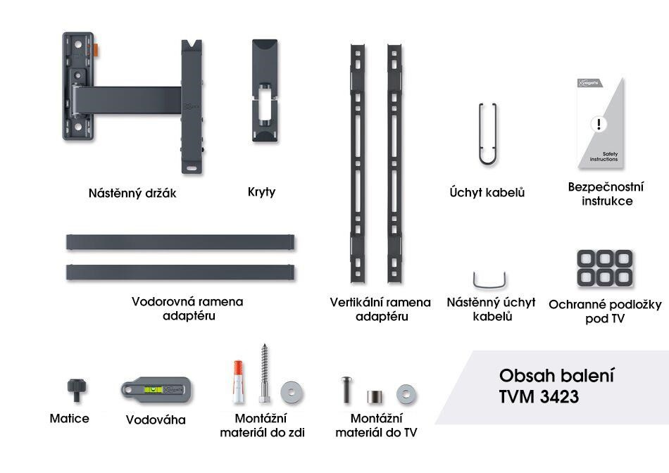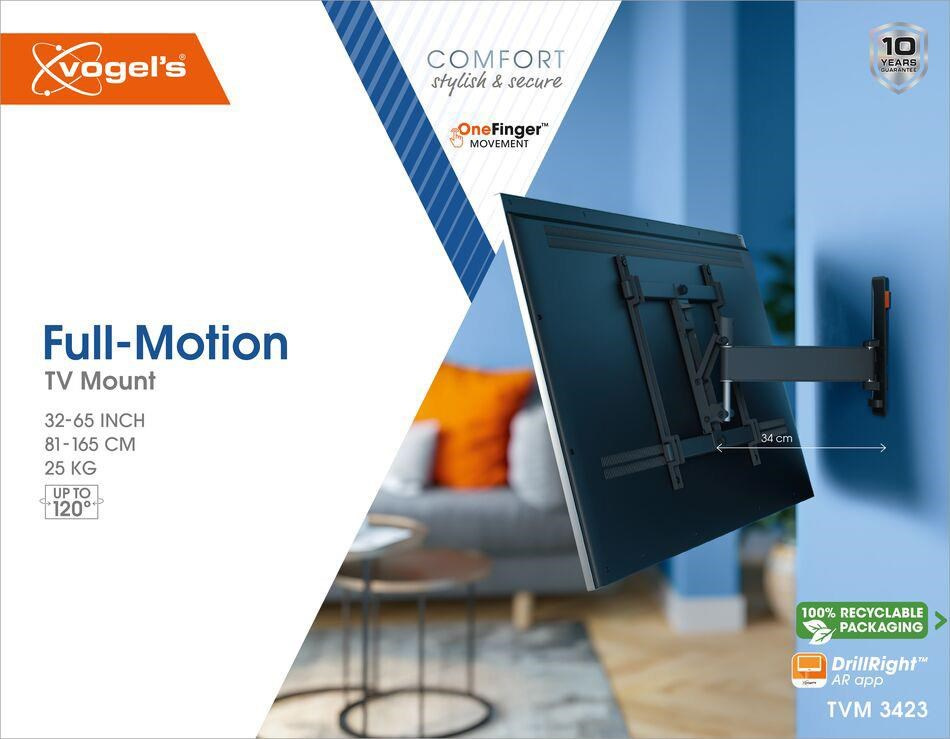 Společnost Vogel's vám instalaci držáku co nejvíce usnadní. Balení obsahuje vrtací šablonu, šrouby, hmoždinky Fischer® DuoPower, stahovací pásky na kabely a vodováhu. Pomocí naší bezplatné aplikace DrillRight™ AR App si snadno vyznačíte první vrtací otvor a pokyny k montáži najdete ve stručném průvodci instalací. Nebo si prohlédněte podrobný návod či speciální instalační video online. S držákem TVM 3423 je zaručena bezpečná montáž televizoru. Každý držák je certifikován TÜV a testován na trojnásobek své maximální hmotnosti. Ne nadarmo se na nástěnný držák televizoru COMFORT Full-Motion vztahuje desetiletá záruka.