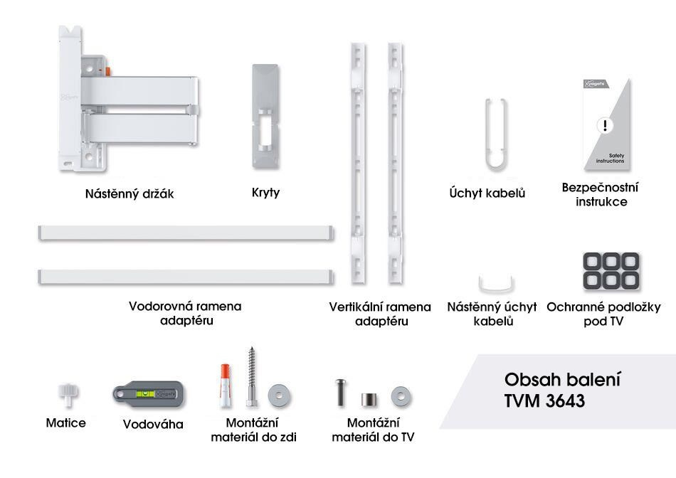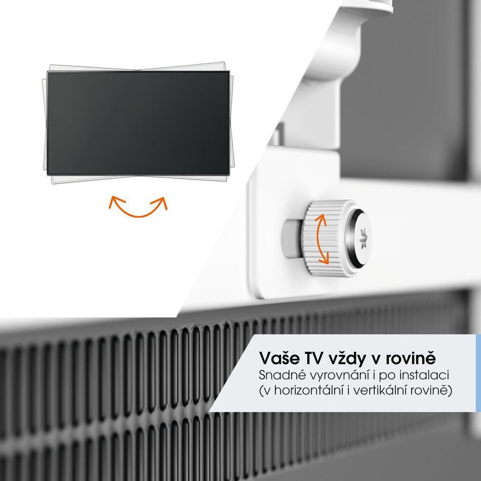 Pro bezpečné naklonění televizoru je nástěnný držák vybaven systémem TiltAnchor™, kterým můžete uzamknout naklánění TV. Měkké podložky na nástěnném držáku chrání zadní stranu televizoru před poškrábáním během jeho montáže. TVM 3643 se snadno instaluje. Součástí balení je vrtací šablona, šrouby, hmoždinky Fischer® DuoPower, stahovací pásky na kabely a vodováha. Jednoduše si vyznačte první vrtací otvor pomocí naší bezplatné aplikace DrillRight™ AR. Je váš televizor mírně nakřivo? Žádný problém. Můžete jej snadno vyrovnat, a to i po instalaci.