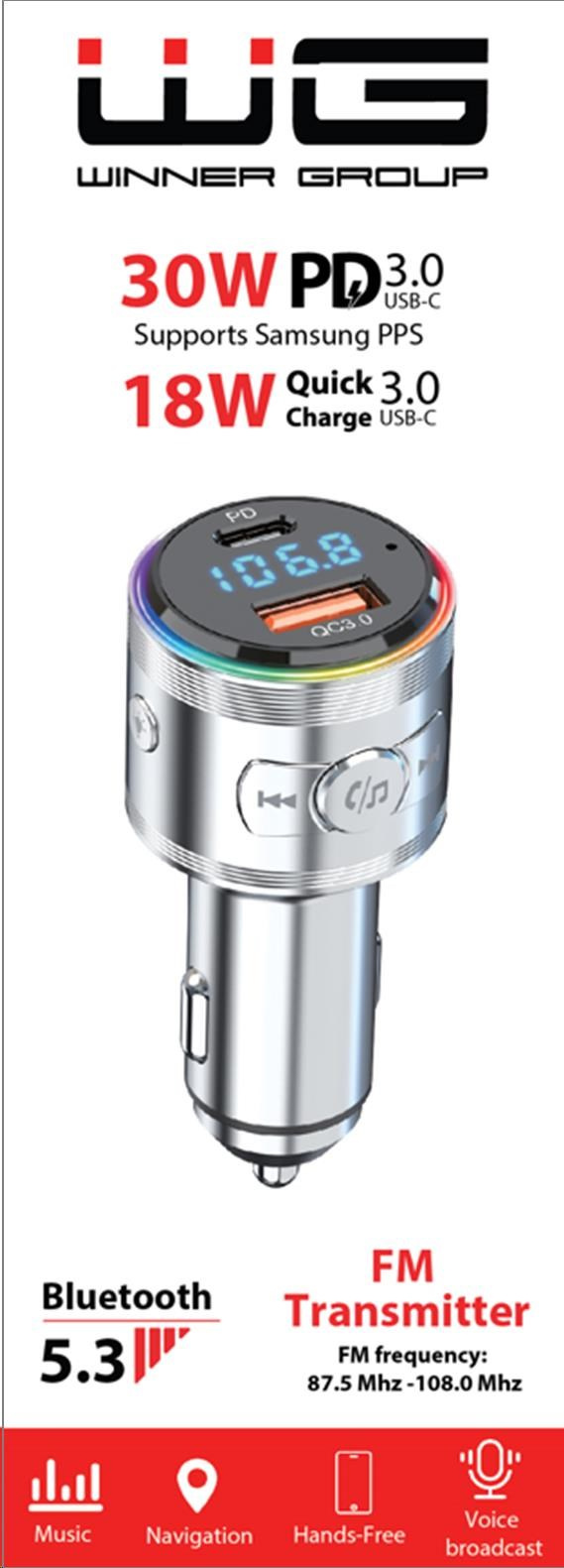 Autonabíječka s PD 3.0 USB-C 30W, QC 3.0 USB-A 18W, Bluetooth 5.3 a FM radio transmitter ve stříbrné barvě je moderní multifunkční zařízení pro nabíjení a zábavu na cestách. S vysokým výkonem a pokročilými funkcemi vám poskytne maximální pohodlí při cestování a zajistí, že vaše zařízení budou vždy nabitá.