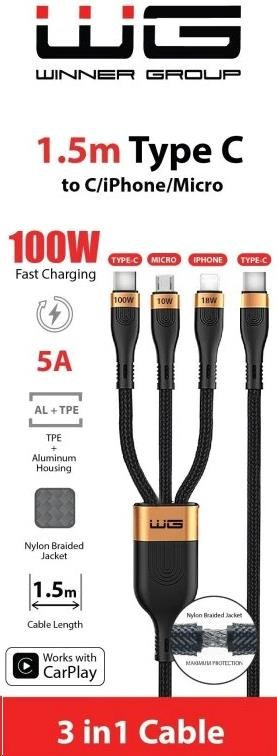 Obsah balení: Datový kabel USB-C na 3v1 (USB-C + Lightning + Micro USB) 1,5 m