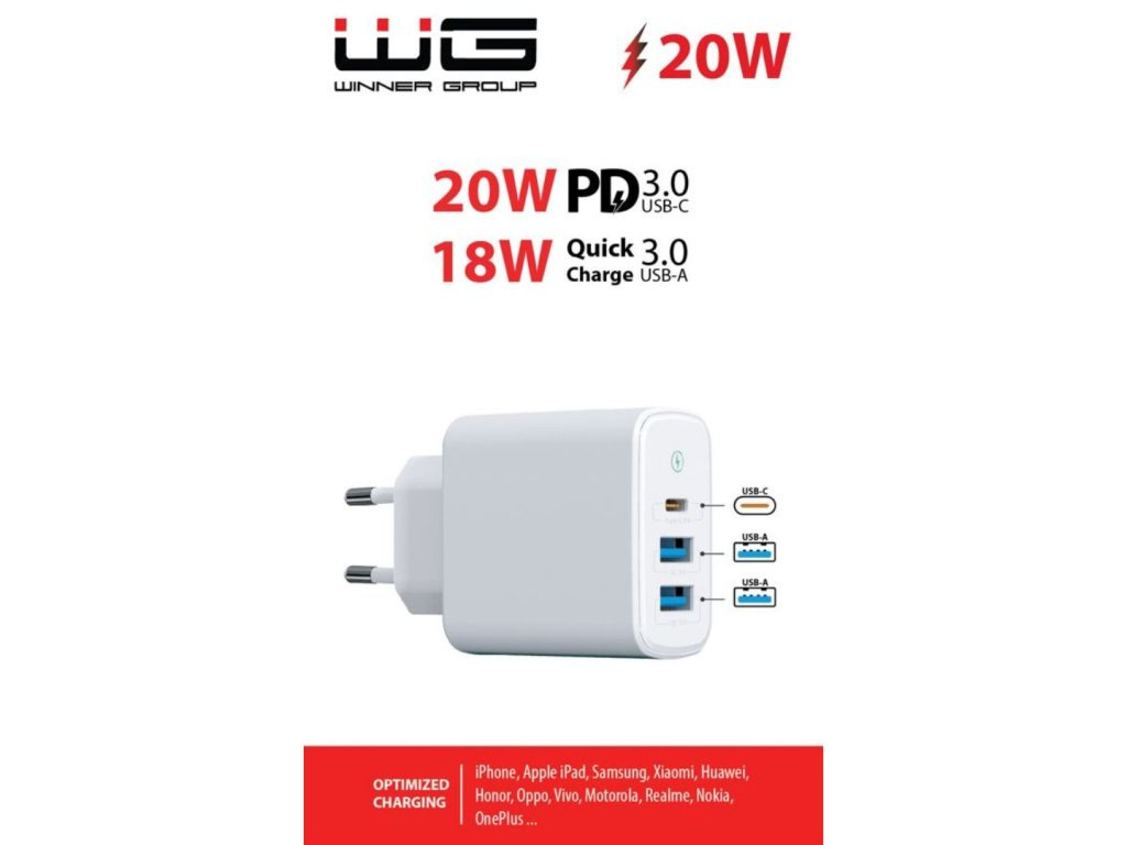 Síťová nabíječka se třemi USB porty 20W je výkonná a odolná proti přehřívání. Díky třem portům 1x USB-C a 2x USB-A nabízí široké možnosti využití pro smartphony, tablety i další elektroniku.