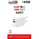 Popis WG Síťová nabíječka GaN 2xUSB (A+C)/USB-C PD45W+USB-A QC3.0 18W/white