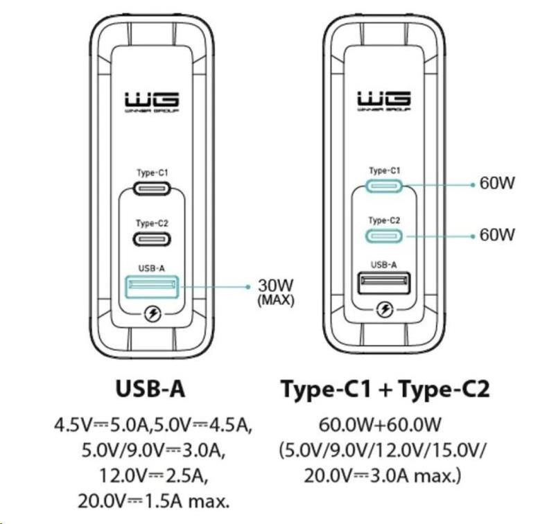 - USB-C1+USB-C2: 5V/9V/12V/15V/20V?3A max. (60W+60W)