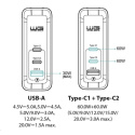 - USB-C1/C2 +USB-A: 5V/9V/12V/15V?3A, 20V?4.35A max (87W+30W)