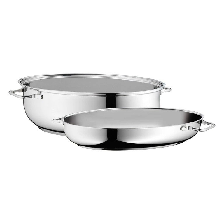 Mistr pro pečení, smažení i dušení v jednom balení. Tento prostorný oválný pekáč WMF je nepostradatelným pomocníkem pro přípravu velkých porcí masa, drůbeže nebo zapékaných pokrmů. Jeho unikátní konstrukce 2v1 umožňuje využít poklici jako plnohodnotnou servírovací pánev.