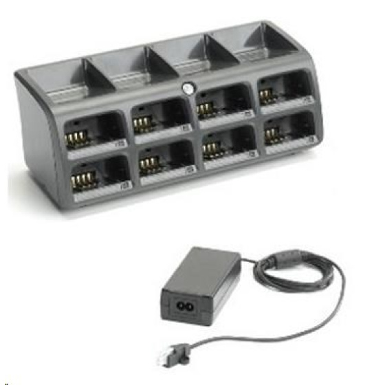 Charging station for 8 batteries, for standard and high capacity, incl. power supply. Please also order AC power cord (kabeurosw) separately, fits for Zebra RS507.