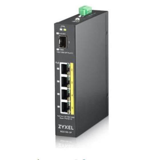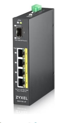 Popis Zyxel RGS100-5P 5-port Gigabit PoE switch, 4x GbE + 1x SFP, PoE budget 120W, DIN rail/Wall mount, IP30